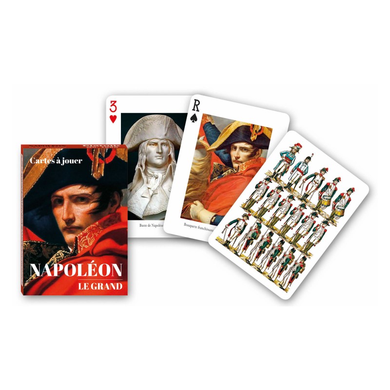 Pachet cu 55 de carti de joc de colectie (52 de carti de joc + 2 jokeri + o carte descriptiva), fiecare carte de joc avand ca background cate o pictura, sculptura, gravura, toate avand ca tema personalitatea lui Napoleon Bonaparte, precum si marile sale succese militare.