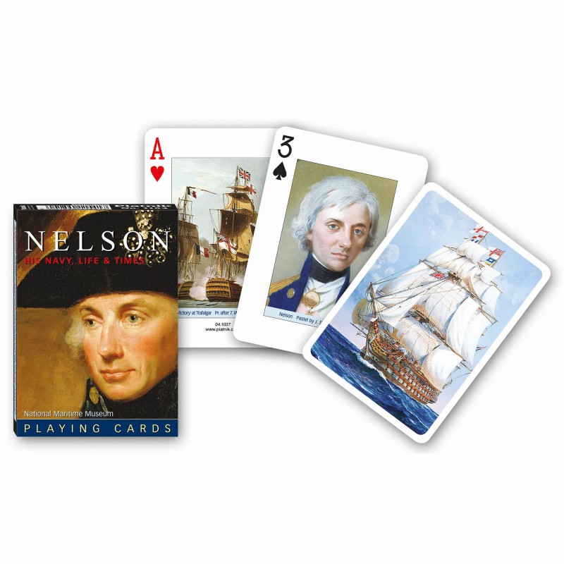 Pachet cu 55 de carti de joc de colectie (52 de carti de joc + 2 jokeri + o carte descriptiva), fiecare carte de joc avand ca background cate o pictura, sculptura, gravura, toate avand ca tema personalitatea amiralului englez Horatio Nelson, cel care l-a invins pe Napoleon in batalia navala decisiva de la Trafalgar, precum si marile sale succese militare.