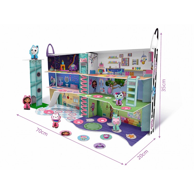 Cutia jocului se transforma in casuta lui Gabby, care devine un veritabil castel mare si frumos,cu dimensiunile de 70cm x 35cm x 20 cm.
