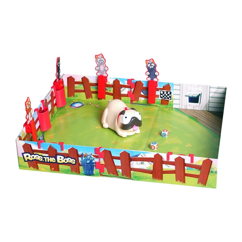 Nota: Catelul Ross este o jucarie cu baterii(neincluse in cutie), iar pisicile care stau pe gard au un senzor care le face sa sara daca sunt atinse de catel, pentru distractie maxima asigurata!!