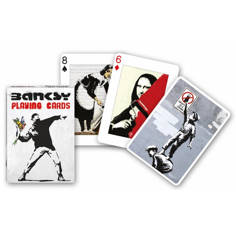 Pachet cu 55 de carti de joc de colectie (52 de carti de joc + 2 jokeri + o carte descriptiva), fiecare carte de joc avand ca background o imagine cu una din lucrarile grafitti a celebrului si controversatului artist anonim Banksy.