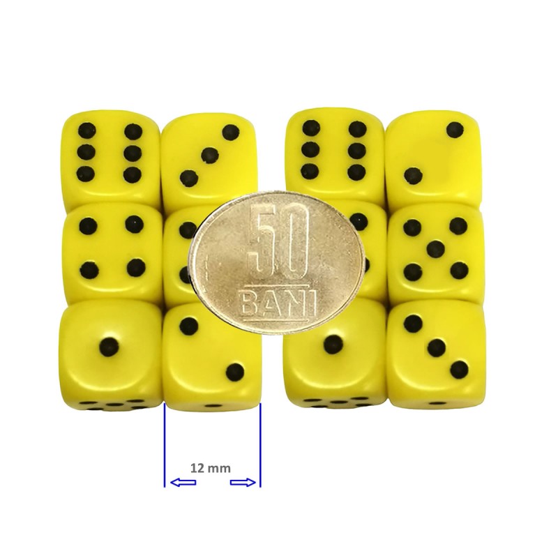 Va oferim un set de 12 zaruri galbene, cu latura de 12 mm, pentru jucat Yamms si alte jocu..