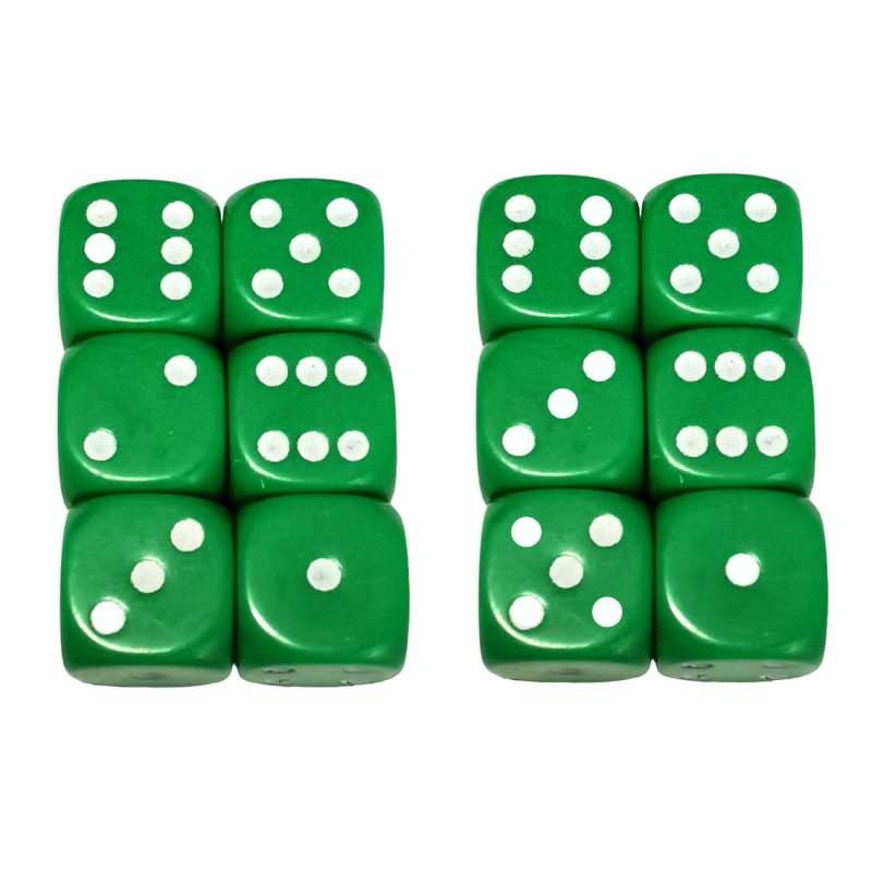 Va oferim un set de 12 zaruri verzi cu latura de 12 mm, pentru jucat Yamms si alte jocuri de societate.