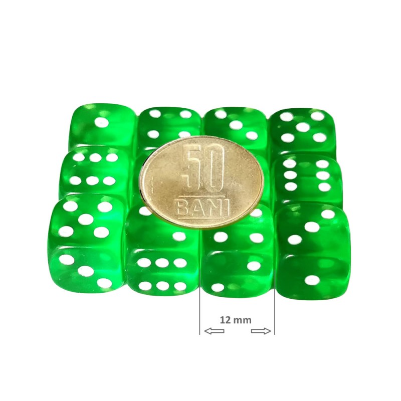 Va oferim un set de 12 zaruri verzi cu latura de 12 mm, pentru jucat Yamms si alte jocuri de societate.